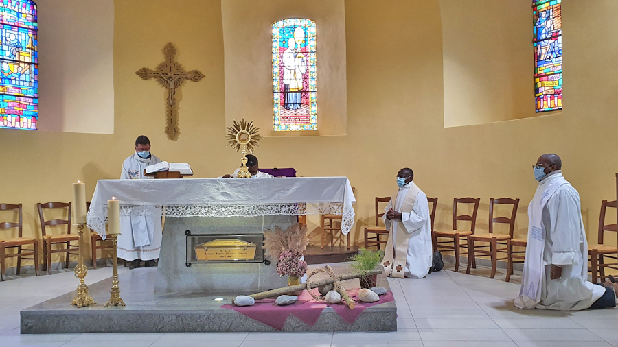 Nous nous sommes rassemblés ce vendredi 19 mars 2021 pour fêter Saint-Joseph et toute à la joie de retrouver la chapelle Eymard dans sa douce lumière, après sept semaines de travaux. Des dégâts liés à l’incendie des nappes d’autel avaient noirci et couvert de suie les murs. La réfection de la peinture a nécessité un travail lourd et complexe. L’assurance a couvert l’ensemble de la dépense pour un montant de 53.000 €. Par ailleurs, la résonnance des sons rendant inaudible les célébrations, il était indispensable que la chapelle bénéficie d’une meilleure acoustique. C’est avec 9 coussins suspendus et 4 panneaux muraux, absorbant les sons parasites, que nous espérons venir à bout de ce désagrément. L’usage de ces matériaux semble montrer une bonne efficacité. Cette dépense a été prise en charge par le Centre de spiritualité Eymard pour un montant de 5.300 €.
