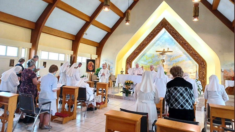 La célébration a eu lieu dans la chapelle du Foyer de Charité, de l’Ile d’Orléans, avec le P. Ghislain Cossette, supérieur provincial, comme célébrant principal, et les deux jubilaires: Émilien LeBlanc et Loyola Gagné. Sr Christine, qui avait organisée elle-même cette fête, est assise devant son prie-Dieu, dans la première rangée.