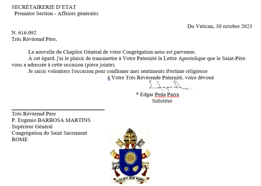 Chers frères, c'est avec une joie particulière que je m'adresse à vous qui êtes réunis pour le 36ème Chapitre Général. C'est un moment très significatif pour votre famille religieuse, un temps fort de dialogue entre vous et d'écoute du Saint-Esprit qui vous permettra d'évaluer la vie et la mission de votre Congrégation au regard de la marche de l'Église, de l'évolution de la société dans laquelle vous vivez et des défis actuels de la Vie Consacrée. À la lumière de l'Assemblée générale ordinaire du Synode des Évêques que l'Église universelle a vécu ces jours-ci, je vous invite à faire, vous aussi, une expérience synodale qui implique écoute mutuelle et dialogue sincère. Je tiens aussi à rappeler la mémoire du Père José Ramón Aristi, SSS, avec lequel j'eu l'occasion de célébrer la miséricorde de Dieu lorsque j'étais Archevêque de Buenos Aires. Qu'il accompagne votre chemin dans la célébration de ce Chapitre.