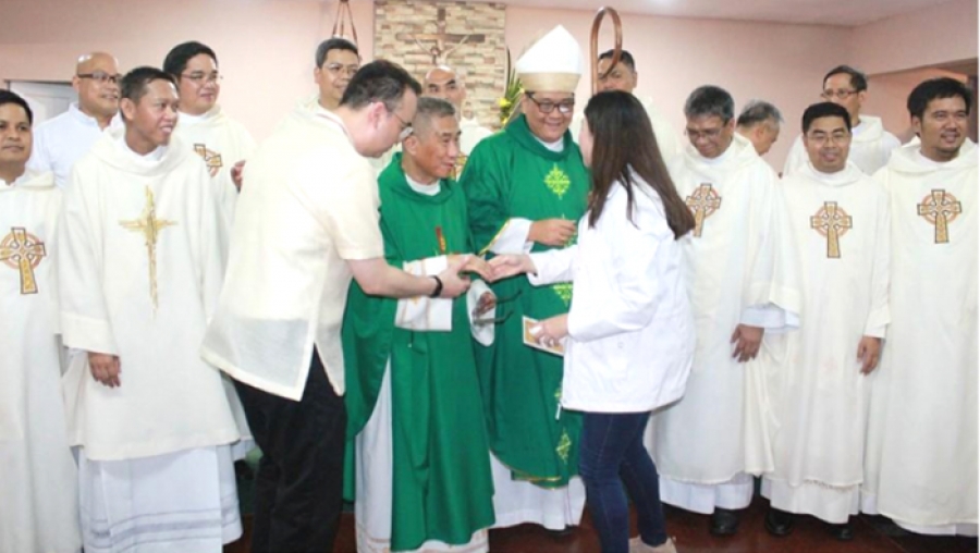 Cependant, trois jours avant le grand événement, le bureau météorologique a prévenu la population de l’arrivée du super typhon «Ompong» (Mangkhut), qui allait toucher les terres du nord du pays le jour même de notre célébration. La nouvelle n’a pas freiné notre enthousiasme. Nous avons célébré nos messes du Triduum du 12 au 14 septembre 2018. Le grand jour du 15 septembre 2018, tous les fidèles se sont réunis à la paroisse à 4 h du matin, au milieu des vents violents et de la pluie, car nous étions censés avoir notre procession communautaire en l'honneur de notre patron, saint Vincent Ferrer. Nous avons acheminé la procession autour de la paroisse et prié le Saint Rosaire après. Il a plu toute la matinée, mais cela s'est arrêté l'après-midi. Nous avons eu la chance d'avoir du beau temps du début à la fin de la célébration, à l'exception d'une forte averse de pluie quand tout le monde était déjà à l'intérieur de l'église. Nous avons vécu une célébration très significative, belle et solennelle de notre érection canonique et de l’installation de notre premier curé de la paroisse, le p. Jose Arnel A. Martinez sss.
