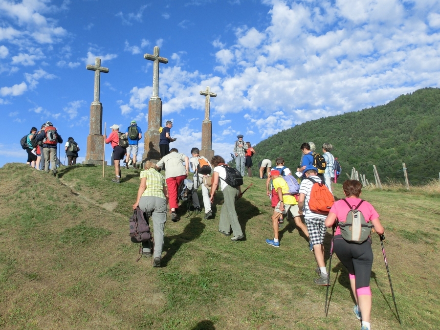 La nostra giornata di condivisione e di preghiera è incominciata partendo dalle Tre Croci di La Mure. Ogni anno, è proposta una marcia per gli amici del p. Eymard, che permette ai parrocchiani e a quanti desiderano di vivere un momento di raccoglimento e di condivisione. La prima parte del cammino s’è percorsa nel silenzio, con una stupenda levata del giorno sulle montagne e sui campi d’intorno: era il richiamo all’immensità e alla bellezza dell’opera di Dio. Il percorso che ci ha condotti fino a Villard Saint Christophe era punteggiato di tempi di sosta e di preghiera. Allora, la squadra logistica composta di 4 persone, ci attendeva per permetterci di attraversare le strade in piena sicurezza, di rifocillarci e proporci di alleggerirci dei nostri zaini. Tempi di preghiera e di canti sul tema della pace e della riconciliazione hanno dato un filo conduttore alla giornata.